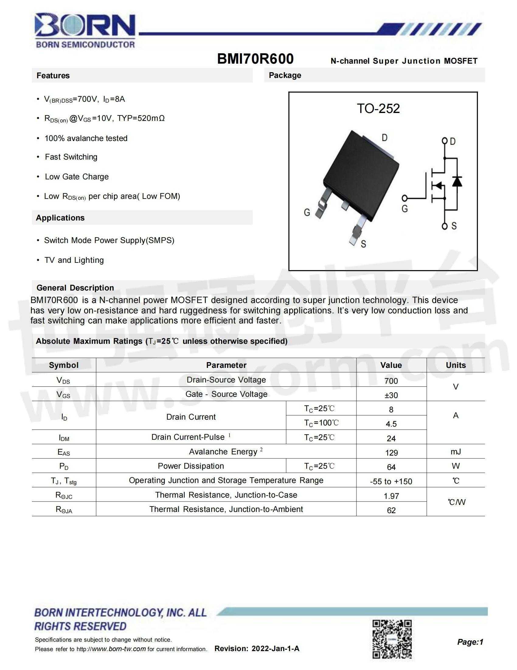 BMI70R600是一款超结MOS采用多层外延工艺技术 ,拥有更优的EMI特性, 超低导通电阻和结电容,有效降低导通损耗和开关损耗,效率高,发热小,可以适应更高的开关频率。
